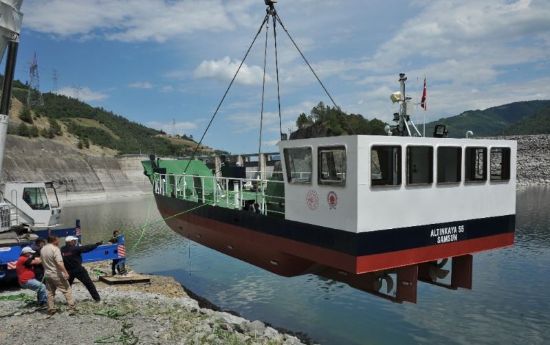 Tuzla’da faaliyet gösteren özel bir firmaya yaptırılan ‘Altınkaya 55’ isimli feribot, Ulaştırma ve Altyapı Bakanlığı tarafından Samsun’un Vezirköprü, Alaçam ve Bafra ilçeleri ile Sinop’un Durağan ilçesinin birbiriyle ulaşımını sağlamak amacıyla Büyükşehir Belediyesi’ne hibe edildi. 2 mürettebat, 12 yolcu, 4 araç kapasiteli, 17 metre uzunluğunda ve 5,60 metre genişliğindeki arabalı feribotun yapımı 6 ay sürdü. İstanbul’dan 20 metre uzunluğundaki TIR ile polis eskortu eşliğinde Samsun’a getirilen feribot, dün de bakanlık ve Büyükşehir Belediyesi’ne bağlı ekiplerin kontrolünde Bafra ilçesinden Altınkaya Barajı’na vinç yardımıyla indirildi.