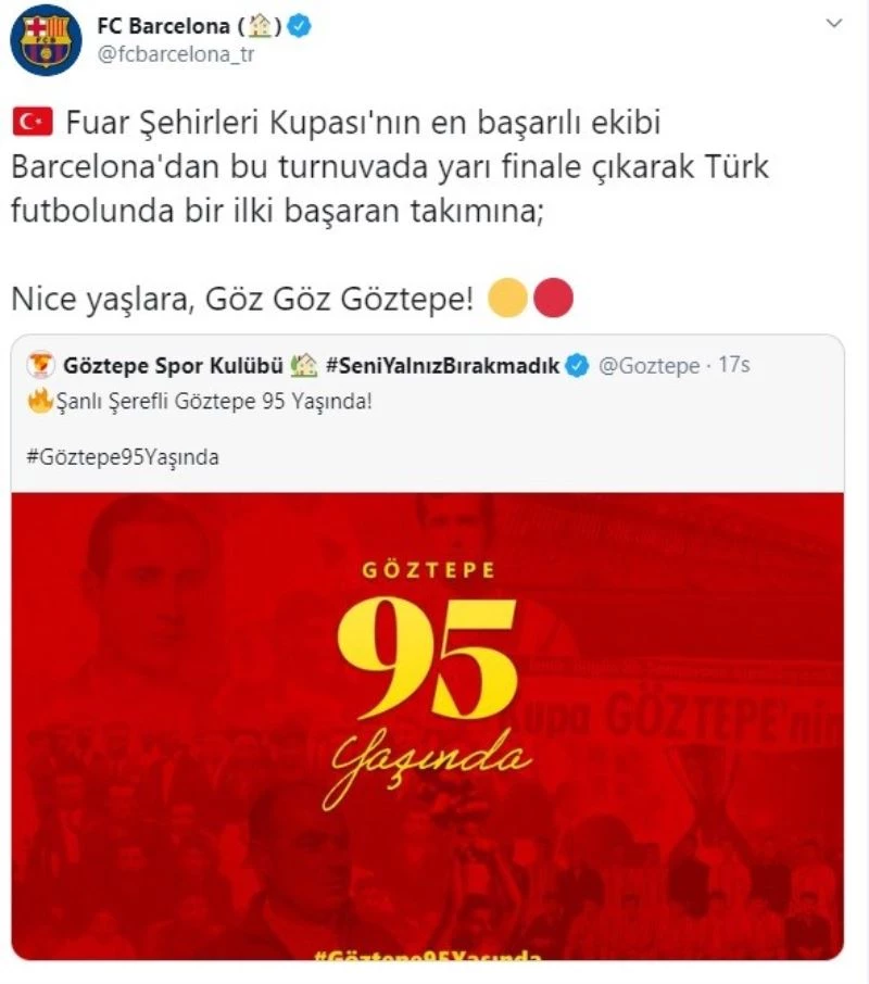 Barcelona Kulübü’nün Türkçe hesabı, yayınladığı paylaşımla Göztepe’nin kuruluşunun 95. yılını kutladı.