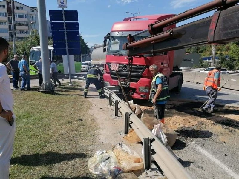 Kaza, Gölcük ilçesi Donma Mahallesi D-130 Karayolu İzmit istikameti mevkiinde meydana geldi. Edinilen bilgiye göre, sürücüsünün ismi öğrenilemeyen Mercedes marka 55 ALM 93 plakalı tır, sürücüsünün direksiyon hakimiyetini kaybetmesi neticesinde yol kenarındaki bariyerlere çarptı. Durumun haber verilmesi üzerine olay yerine sağlık, polis ve itfaiye ekipleri sevk edildi. Sağlık ekipleri tarafından muayene edilen sürücünün sağlık durumunun iyi olduğu öğrenildi. Kaza sebebiyle tırın delilen karterinden yola yağ döküldü. Kayganlaşan yolda ekipler önlem aldı. Tır saplandığı yerden 1 saate yakın uğraşların ardından kurtarılırken, trafiğe kapanan yolda uzun araç kuyrukları oluştu.