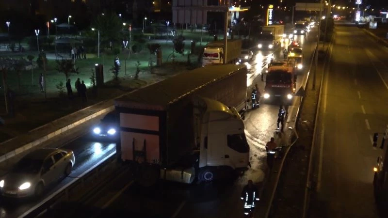 Bariyerlere çarpan tırın deposundan litrelerce mazot aktı, itfaiye hazır bekledi