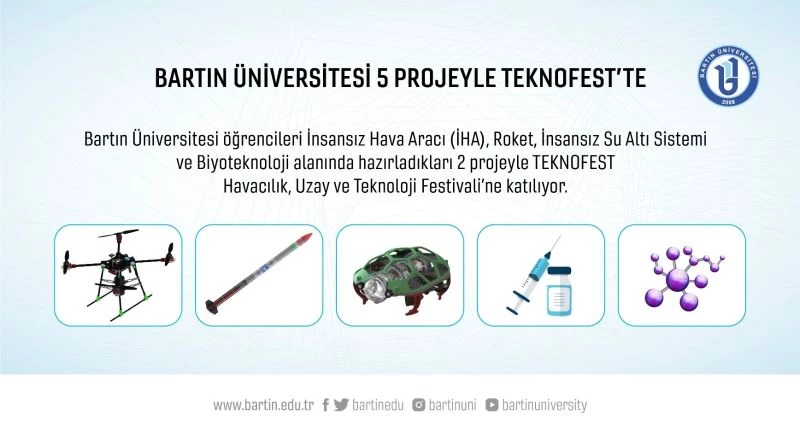 Bartın Üniversitesi öğrencileri İnsansız Hava Aracı (İHA), Roket, İnsansız Su Altı Sistemi ve biyoteknoloji alanında hazırladıkları 2 projeyle TEKNOFEST Havacılık, Uzay ve Teknoloji Festivali’ne katılıyor.