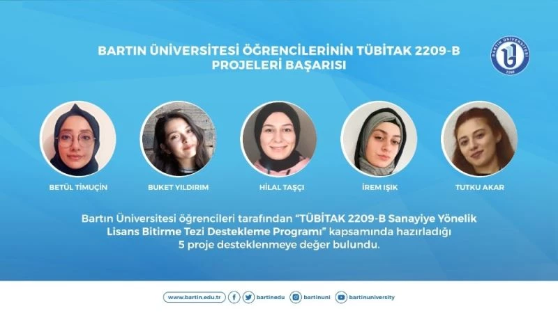 Bartın Üniversitesi öğrencileri tarafından “TÜBİTAK 2209-B Sanayiye Yönelik Lisans Bitirme Tezi Destekleme Programı” kapsamında hazırladığı 5 proje desteklenmeye değer bulundu.