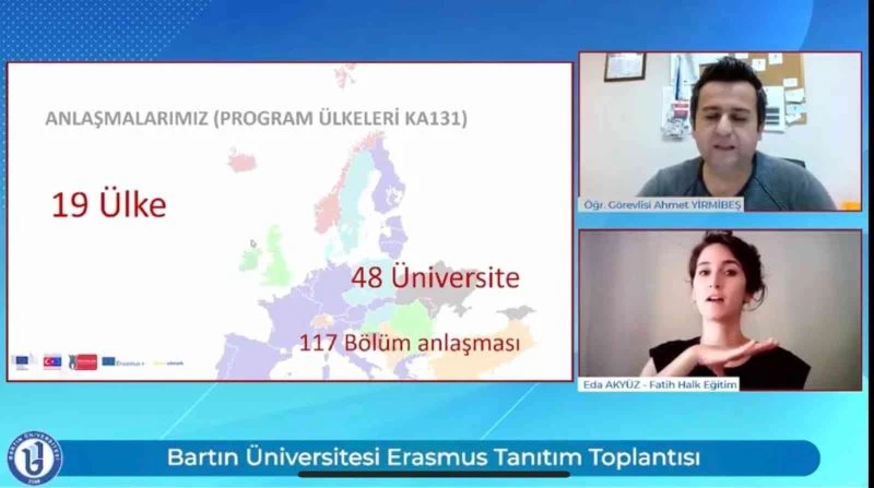 Çevrim içi olarak gerçekleştirilen etkinlikte Bartın Üniversitesi Erasmus Kurum Koordinatörü Öğr. Gör. Ahmet Yirmibeş tarafından bilgiler verildi. Zonguldak Fatih Halk Eğitim Merkezinden Eda Akyüz tarafından işaret diliyle de aktarılan toplantıda 19 farklı ülke ve 48 üniversiteden 117 bölüme yapılabilecek öğrenim hareketliliğinden bahsedildi.