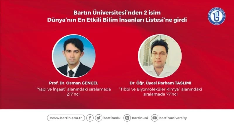 Tüm bilim alanlarında dünyadaki en etkin 100 bin bilim insanının çalışmaları ve faaliyetlerinin ölçüldüğü çalışmada, Bartın Üniversitesi’nden 2 isim de listeye girmeyi başardı. Bartın Üniversitesi Mühendislik, Mimarlık ve Tasarım Fakültesi İnşaat Mühendisliği Bölümü’nden Prof. Dr. Osman Gençel, “Yapı ve İnşaat” alanında sıralamada listelenen dünyadaki 566 akademisyen arasında 217. sırada yer aldı. Bartın Üniversitesi Fen Fakültesi Biyoteknoloji Bölümü’nden Dr. Öğr. Üyesi Parham Taslimi ise “Tıbbi ve Biyomoleküler Kimya” alanında sıralamada listelenen 1.756 akademisyen arasında 77. Sırada yer almayı başardı. Öğretim üyelerinin ‘‘Dünyanın En Etkili Bilim İnsanları’’ listesinde yer aldığı Bartın Üniversitesi birçok alanda yükselişini sürdürmeye devam ediyor. Bartın Üniversitesi son olarak bağımsız bir haber sitesi tarafından 2019 yılındaki uluslararası yayın sayısı dikkate alınarak yapılan devlet üniversiteleri sıralamasında 20 basamak daha yükselerek 108 üniversite arasından 24’üncü sıraya yerleşti. İhtisaslaşan üniversiteler sıralamasında 3’üncü sırada olan Bartın Üniversitesi, Karadeniz Bölgesi’ndeki üniversiteler arasında ise 2’nci sırada yer alma başarısı gösterdi.