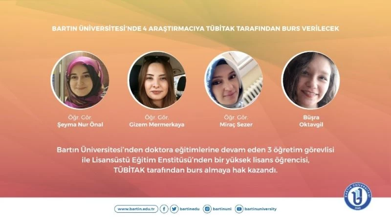 Bartın Üniversitesi’nden doktora eğitimlerine devam eden 3 öğretim görevlisi ile Lisansüstü Eğitim Enstitüsü’nden bir yüksek lisans öğrencisi, TÜBİTAK tarafından burs almaya hak kazandı.