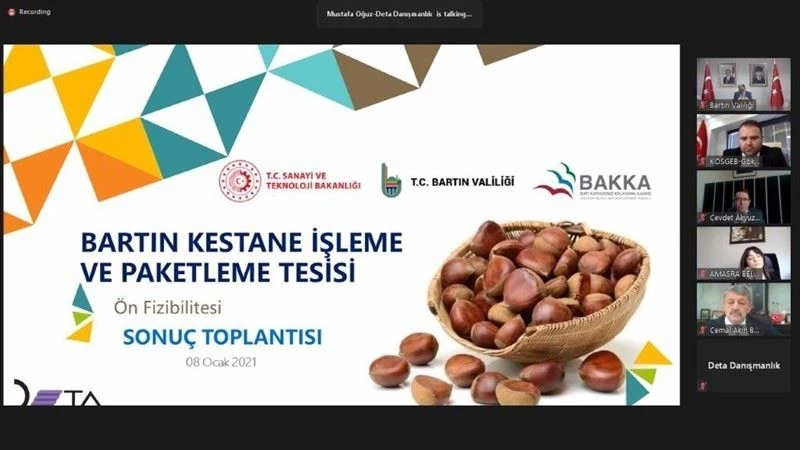 Bartın Valisi Sinan Güner’in talimatları doğrultusunda Batı Karadeniz Kalkınma Ajansı(BAKKA) iş birliği ile "Bartın Kestane İşleme ve Paketleme Tesisi Ön Fizibilite Çalışması" adı altında zoom üzerinden kapanış toplantısı yapıldı.