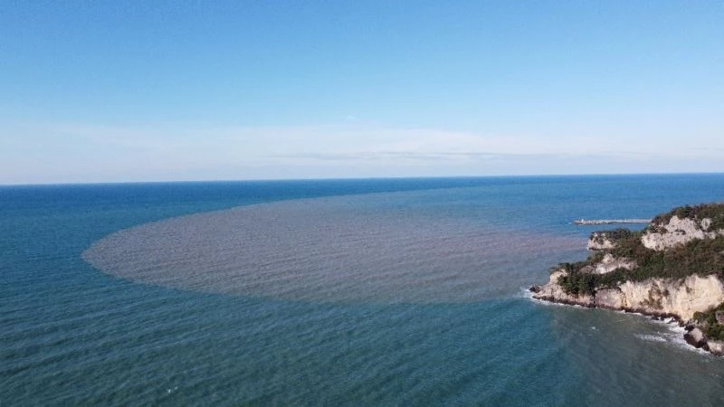 Geniş bir alanı kaplayan ve deniz yüzeyinin rengini değiştiren çamurlu sular drone ile havadan görüntülendi.