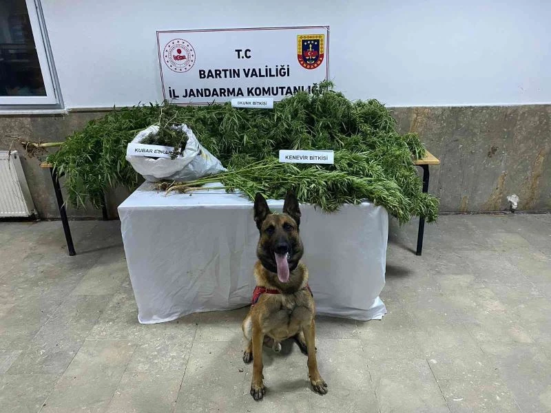 Bartın Cumhuriyet Başsavcılığı koordinesinde İstihbarat Şube Müdürlüğü özel ekip dedektiflerince yapılan istihbari çalışmalar neticesinde 1 kişi gözaltına alındı. Bartın’ın Çakırkadı köyünde ikamet eden M.K. isimli şahsın evinde, bahçesinde ve eklentilerinde yapılan aramada boyları 50 cm ile 1 metre arasında değişen 15 kök kenevir bitkisi olduğu değerlendirilen bitki, boyu 3.5 metre uzunluğunda skunk olduğu değerlendirilen 1 kök bitki ve yaklaşık 1,5 kilogram kubar esrar maddesi ele geçirildi. Şüphelinin jandarmadaki sorgusu sürüyor.