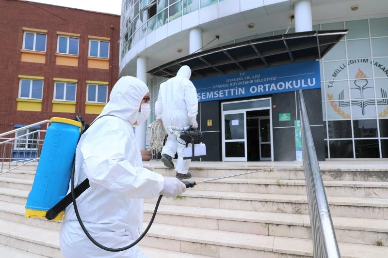 Başakşehir Belediyesi Sağlık İşleri Müdürlüğü ekipleri, özel tulumlarını giyerek insan sağlığına zararsız alkollü dezenfektanlarla sıralardan oyun gruplarına, tuvalet ve camlardan duvarlara kadar öğrencilerin kullanacağı tüm alanları dezenfekte etti.