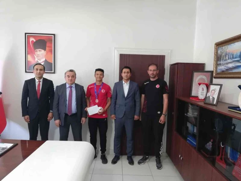 Bozüyük Kaymakamı Adem Öztürk’ü, atletizm yarışmasında başarılı olan sporcuyu tebrik etti.