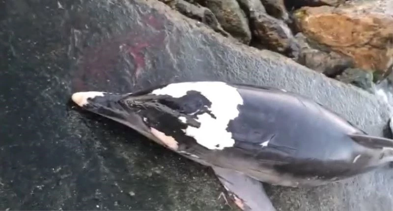 Bursa’da 2,5 metre uzunluğunda başından yaralı ölü yunus sahilde bulundu.