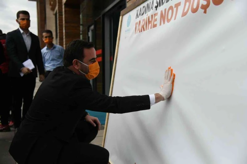 Başkan Özlü’nün konuşmasının ardından katılımcılar “kadına şiddete hayır diyoruz tarihe not düşüyoruz” yazan panoya ellerini turuncuya boyayarak, el izlerini bıraktı.