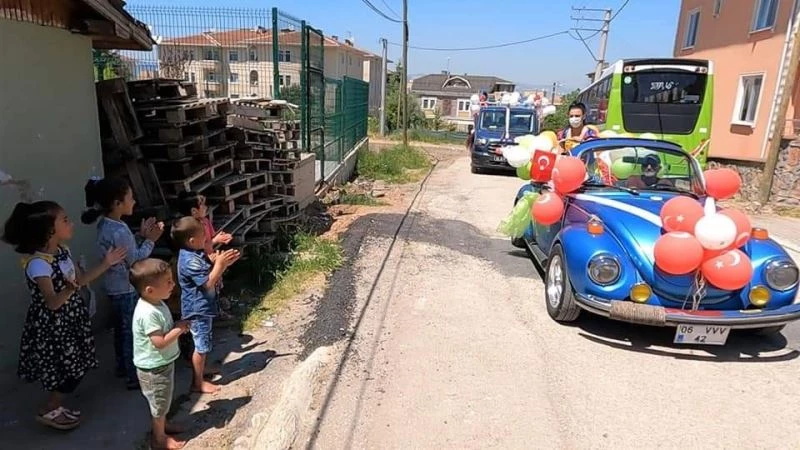 Başiskele Belediyesi ekipleri tarafından süslenen üstü açık klasik woswoslar ve belediye araçlarının oluşturduğu kortej, çocuk şarkıları eşliğinde mahalleleri dolaştı.