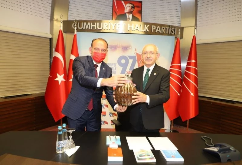 Ankara’daki temaslarının sonunda ise Başkan Çetin Akın, CHP Genel Başkan Yardımcısı Seyit Torun, CHP Manisa Milletvekili Bekir Başevirgen, CHP Manisa İl Başkanı Semih Balaban, CHP Turgutlu İlçe Başkanı Hüseyin Oğuz, İYİ Parti Turgutlu İlçe Başkanı Önder Ertaş, Başkan Yardımcıları Fırat Honaz, Ahmet Daşkan ve Özel Kalem Müdürü Ali Nasuhoğlu ile birlikte CHP Genel Başkanı Kemal Kılıçdaroğlu ile CHP Genel Merkezinde bir araya geldi. Başkan Çetin Akın’ın Turgutlu’da gerçekleştireceği proje ve çalışmalar hakkında Genel Başkan Kemal Kılıçdaroğlu’nun görüşlerinin alındığı ziyarette Başkan Akın ayrıca Turgutlulular’ın selamını iletti. Görüşmenin sonunda Başkan Akın, Genel Başkan Kılıçdaroğlu’na isminin yazılı olduğu Turgutluspor forması ile Manisa’nın meşhur üzümü ve mesir macununu hediye etti.