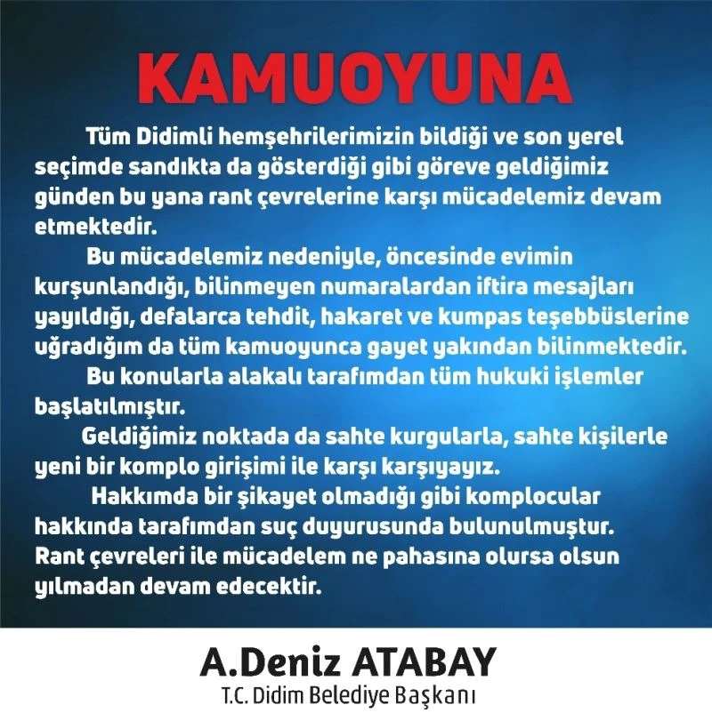 Başkan Atabay konu ile ilgili olarak yaptığı açıklamada, “Tüm Didimli hemşehrilerimizin bildiği ve son yerel seçimde sandıkta da gösterdiği gibi göreve geldiğimiz günden bu yana rant çevrelerine karşı mücadelemiz devam etmektedir. Bu mücadelemiz nedeniyle, öncesinde evimin kurşunlandığı, bilinmeyen numaralardan iftira mesajları yayıldığı, defalarca tehdit, hakaret ve kumpas teşebbüslerine uğradığım da tüm kamuoyunca gayet yakından bilinmektedir. Bu konularla alakalı tarafımdan tüm hukuki işlemler başlatılmıştır. Geldiğimiz noktada da sahte kurgularla, sahte kişilerle yeni bir komplo girişimi ile karşı karşıyayız.
