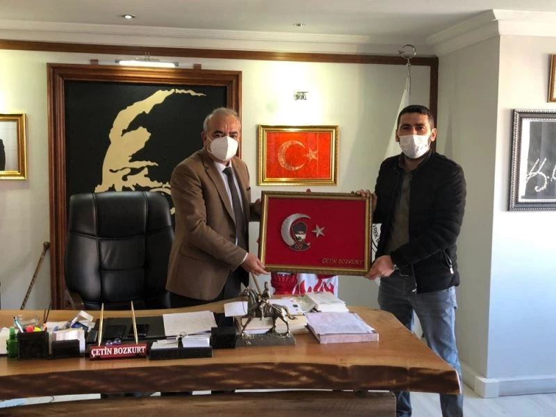 Esnaf Mustafa Burgaz Başkan Bozkurt’a ziyareti anısına Atatürk tablosu hediye etti. Başkan Bozkurt da Burgaz’a ziyaretleri ve nazik düşünceleri nedeniyle teşekkür etti.