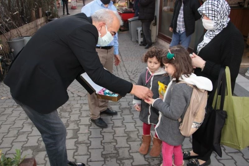 Devrek Belediye Başkanı Çetin Bozkurt çocuklarla bir araya gelerek çikolata dağıttı.