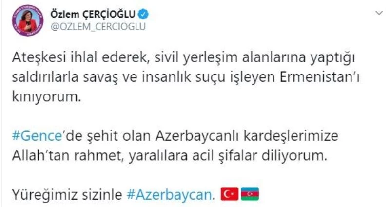 Azerbaycan ve Ermenistan arasında dün yürürlüğe giren ateşkesin üzerinden 24 saat geçmeden ateşkesi ihlal ederek tekrar saldıran Ermenistan’a tepkiler gelmeye devam ediyor. Ermenistan’ın, Azerbaycan’ın Gence kentinde sivil yerleşim yerlerini hedef alarak füzeli saldırı gerçekleştirmesiyle aralarında çocukların da olduğu 9 sivil hayatını kaybetti, 39 kişi de yaralandı. Yaşanılan bu durum karşısında uluslararası hukuku çiğneyen Ermenistan’a tepkiler gelmeye devam ederken bir kınama mesajı da Aydın Büyükşehir Belediye Başkanı Özlem Çerçioğlu’ndan geldi. Başkan Çerçioğlu, sosyal medya hesabı üzerinden yaptığı açıklamada “Ateşkesi ihlal ederek, sivil yerleşim alanlarına yaptığı saldırılarla savaş ve insanlık suçu işleyen Ermenistan’ı kınıyorum. Gence’de şehit olan Azerbaycanlı kardeşlerimize Allah’tan rahmet, yaralılara acil şifalar diliyorum. Yüreğimiz sizinle Azerbaycan” ifadelerine yer verdi.