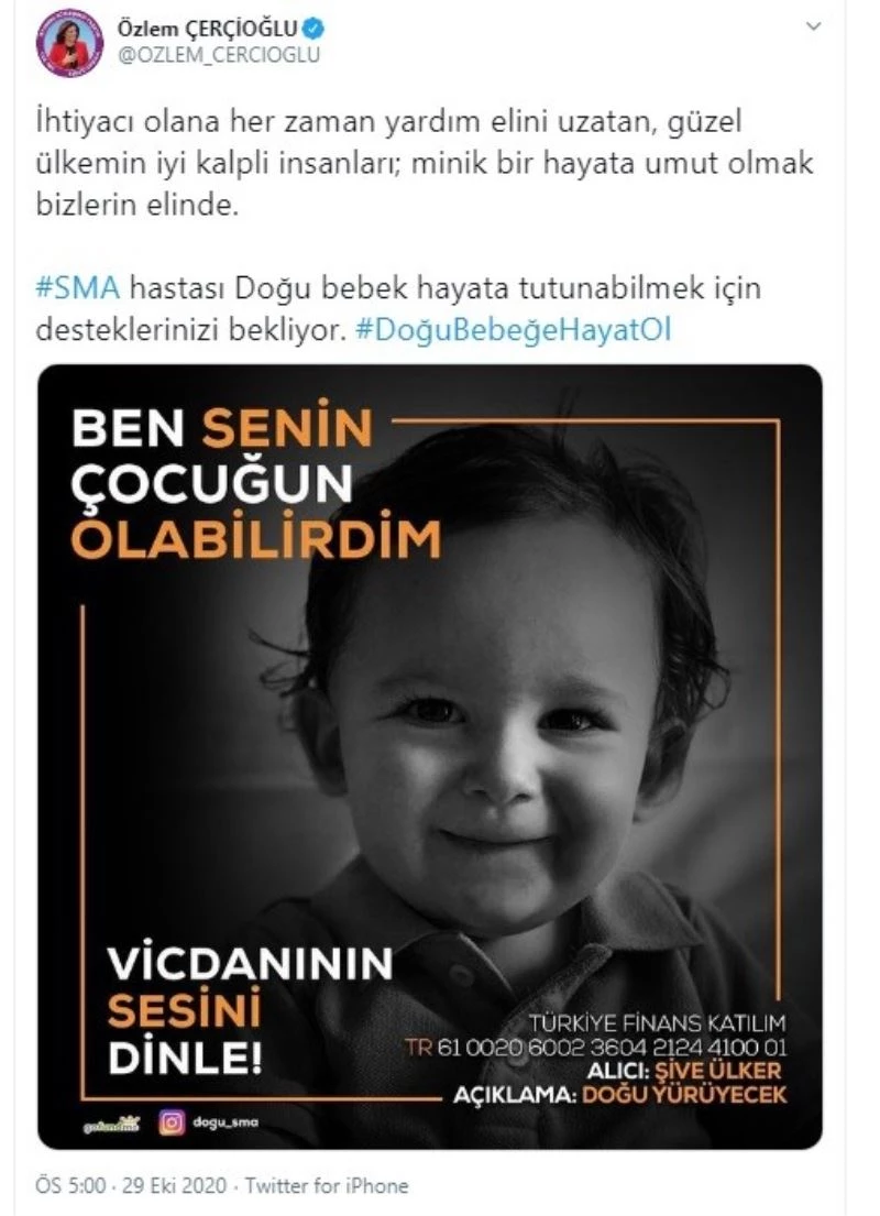 Bu yılın başında tip 1 SMA teşhisi konan 14 aylık Doğu bebek, ABD’de tedavisinin yapılabilmesi için yardım bekliyor. Doğu bebek için gerekli miktarın büyük bir çoğunluğu toplanırken, Aydın Büyükşehir Belediye Başkanı Özlem Çerçioğlu gerekli 2.4 milyon dolardan kalan 160 bin doların da toplanabilmesi için sosyal medya hesapları üzerinden yardım çağrısında bulundu. Başkan Çerçioğlu, "Bizce her insan hayatının bir döneminde bir canın kahramanı olmuştur. Şimdi de Doğu bebek için kahramanlıkta bulunma zamanı. Doğu bebeğin kahramanı biz olalım" ifadelerini kullandı.