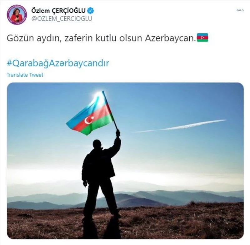 Azerbaycan Cumhurbaşkanı İlham Aliyev’in, Ermenistan’a karşı kazandıkları zaferi ilan etmesinin ardından, kardeş ülke Türkiye’den de tebrik mesajları gelmeye başladı. Ermenistan’ın yenilgiyi kabul etmesiyle birlikte Karabağ’daki haklı mücadelenin zaferle sonuçlanması haberini alan Aydın Büyükşehir Belediye Başkanı Özlem Çerçioğlu da sosyal medya hesabından yaptığı paylaşımla Azerbaycan’ın zaferine ortak oldu. Başkan Çerçioğlu, Azerbaycan’ın zaferini simgeleyen bir fotoğrafla yaptığı paylaşımında “Gözün aydın, zaferin kutlu olsun Azerbaycan” ifadelerine yer verdi.