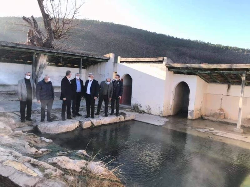 İl Başkanı Sebahattin Ceyhun, Belediye Başkanı Fatih Çalışkan, AK Parti İlçe Başkanı Ali Var ile birlikte Esire Termal Bölgesinde bulunan ve Kont Drakula’ın cüzzam hastalığından şifa bulduğu rivayet edilen Romalılar döneminden kalma şifalı suya sahip tarihi hamamda incelemelerde bulundu.