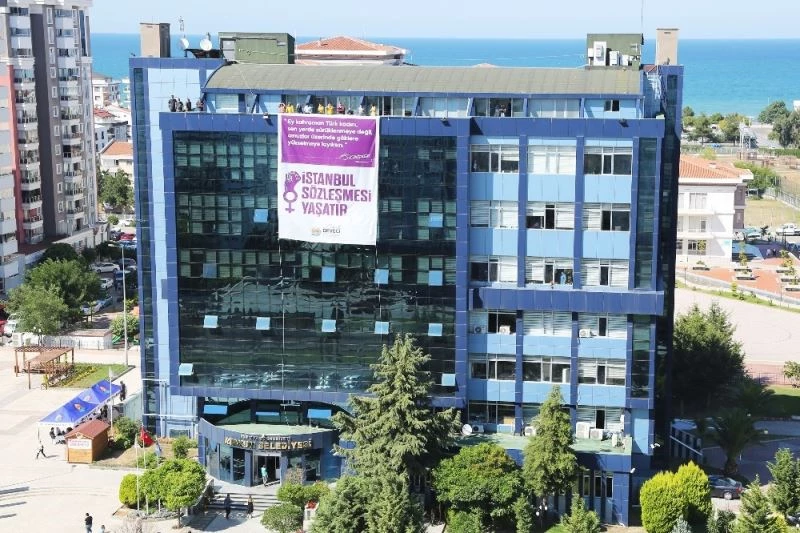 Atakum Belediyesi çalışanları, ’İstanbul Sözleşmesi’nin yürürlükte kalması için belediye hizmet binasına, üzerinde Mustafa Kemal Atatürk’ün bir sözü ile “İstanbul Sözleşmesi Yaşatır” mesajını içeren 75 metrekarelik dev bir pankart astı.
