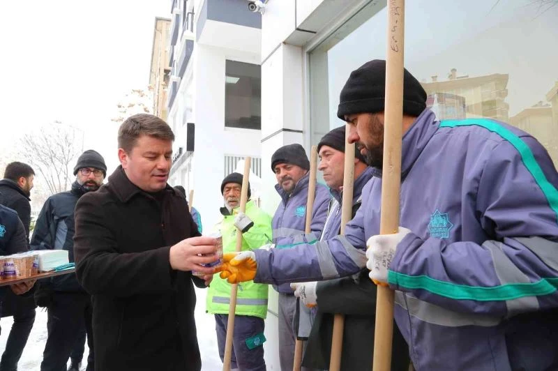 Başkan Dinçer kar temizlik personeline pekmez ikram etti