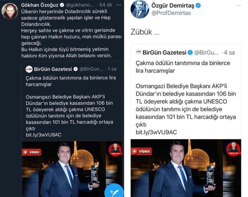 "Son olarak, UNESCO’dan ödül kısmına değinecek olursak. Evet, tören Unesco tarihi binasında gerçekleştirildi ki bu da etkinliğe, katılan belediyelerin motivasyonu, işin önemi için son derece kıymetli olduğu ortada. Öyle olmasaydı bu kadar konuşulmazdı diye düşünüyorum. Haber servisi ile ilgili olarak; bu noktada bazı ajanslar ya da basın bürosunda görevli çalışma arkadaşımız tarafından da olabilir ‘UNESCO’da, UNESCO’dan ibaresi kullanıldı. Çokta üzerinde durmadık. Kimseye de suçlamadık. Şimdi, müzemizin tekrar tanıtımı yapıldığı ve müzemiz gündeme geldiği için ‘reklamın kötüsü iyisi olmaz’ diyelim. Diyelim de bu hikâye de iyi biziz kötüde de sizsiniz. Çünkü, araştırmadan, sorgulamadan 1 yıldır ısıtılıp ısıtılıp paylaşılan bu konuya yaklaşımınız çok çirkin. Siz nasıl, ekonomistsiniz? Siz nasıl üniversite de ders veriyorsunuz? Her şeyden önce doğru bilgiyi araştırmanız gerekmez mi? Sonra, 200 bin TL’lik bir tanıtım bütçesi ile milyonlarca kişiye dokunan, sağladığı geri bildirimle koca bir kentin esnafına, çalışanına kazandırdığı ekonomik katkıyı görmüyor, hesaplayamıyor musunuz? Daha da önemlisi müsrif esnaf misali her bulduğunuzun üzerine atlıyor musunuz? Bu konuda böyle yaklaşmanızı gerektirecek, sizi tam olarak ilgilendiren konu nedir? Diğer sanatçı arkadaş, sırf farklı olmak, muhalefet etmek için haksız yere başkalarını karalamasına alet olmak nasıl bir duygudur, bu neyin kafasıdır? O zaman bende sizden yanıt bekliyorum. Sizin, sıradan bir etkinliğe konuşmacı olarak katılmak için istediğiniz ücret, bir konseri için özellikle de geçmişte istediğiniz paralar ortada iken; Osmanlının başkenti, tarihi ve kültür şehri Osmangazi’nin ve Bursa’nın tanıtımı sizden daha mı değersiz. Bursa’nın hatta ülkemizin turizmine katkı koyan Panorama 1326 Bursa Fetih Müzesi’nin tanıtımı için yapılan toplamda 200 bin TL’lik rutin bir çalışmayı hangi hak ve mantıkla ve sorgulamadan karalama hakkını kendinizde buluyorsunuz? Önemi yok, herkes en iyi bildiği işi yapmaya devam edecek. Yani, siz laf, biz iş üretmeye devam edeceğiz. Bu arada her şeye rağmen, sizi dilinizden düşürmediğiniz Panorama 1326 Bursa Fetih Müzesi’ni ziyaret etmeye davet ediyorum."