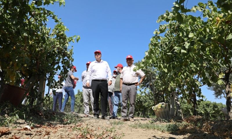 Akhisar Belediye Başkanı Besim Dutlulu, üzüm hasat sezonunun başlaması sebebiyle üzüm bağlarını gezerek çiftçilere şapka ve maske dağıttı, bol ve bereketli bir hasat dönemi diledi.