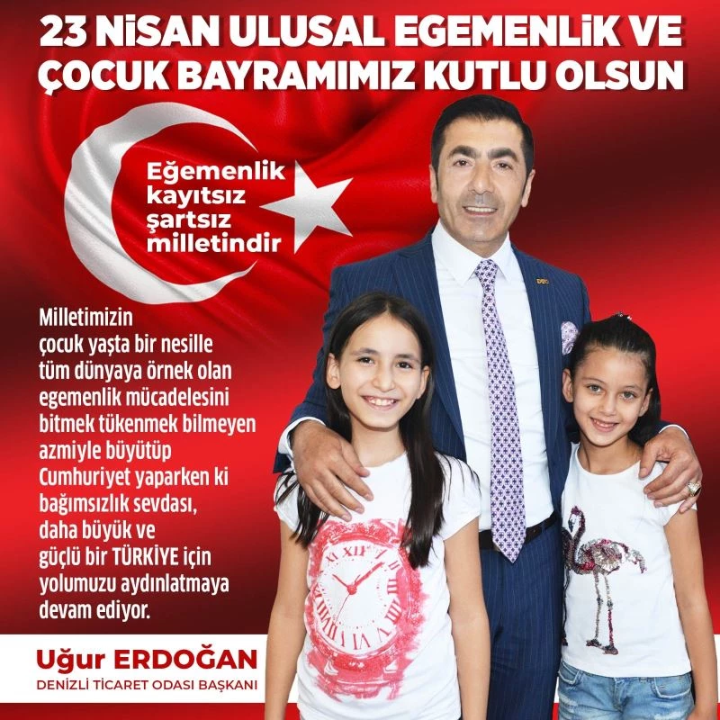 Denizli Ticaret Odası (DTO) Başkanı Uğur Erdoğan, 23 Nisan Ulusal Egemenlik ve Çocuk Bayramı mesajında, “23 Nisan, Türk Milleti’nin yeniden topyekûn ayağa kalktığı bir diriliş destanının vücut bulmuş halidir. Türkiye Büyük Millet Meclisi’nde milli irademizi yansıtan en önemli güçtür” dedi.
