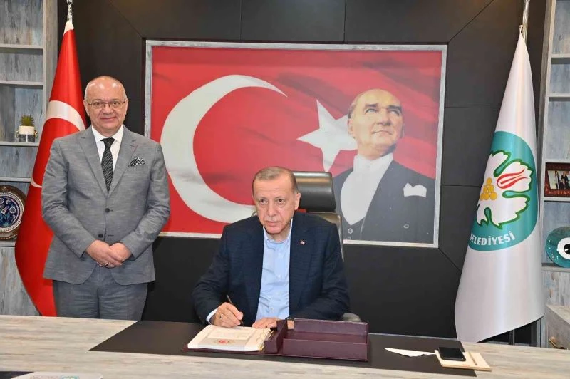 Toplu açılış töreni için Manisa’ya gelen Cumhurbaşkanı Recep Tayyip Erdoğan, Manisa Büyükşehir Belediyesini ziyaret etti. Büyükşehir Belediye Başkanı Cengiz Ergün ile bir araya gelen Cumhurbaşkanı Erdoğan, Büyükşehir Belediyesi anı defterini imzaladı, Başkan Ergün’e çalışmalarında başarılar diledi.