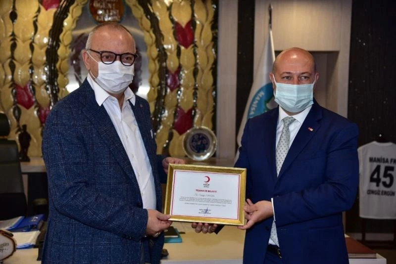Manisa Büyükşehir Belediye Başkanı Cengiz Ergün, Türk Kızılayı Manisa Şube Başkanı Selman Keresteci’yi makamında ağırladı. Keresteci, Kurban Bayramı’nda Türk Kızılayı’na vekalet vermesi nedeniyle Başkan Ergün’e teşekkür belgesi takdim etti.