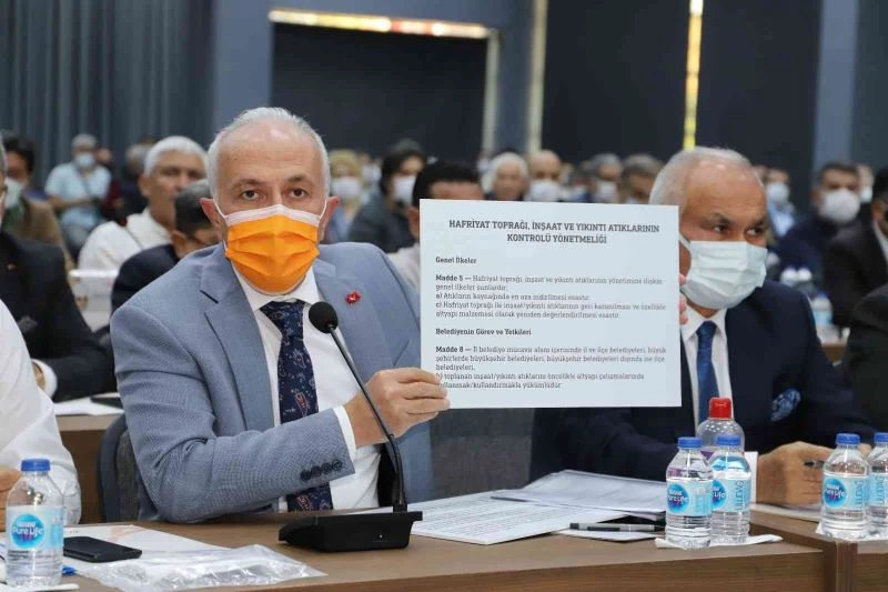 Hafriyat toprağı inşaat ve yıkıntı atıklarının kontrolü yönetmeliğini gösterip konuşmasına devam eden Gültak, “Yönetmeliğin genel ilkelerine göre, atıkların kaynağında en aza indirilmesi esastır. Sonra hafriyat toprağı inşaat yıkıntı atıklarının geri kazanılması ve özellikle altyapı malzemesi olarak yeniden değerlendirilmesi esastır” diye konuştu. Başkan Gültak, aynı yönetmeliğin belediyelerin görev ve yetkileri başlıklı bölümünde de il belediye mücavir alanı içerisinde il ve ilçe belediyeleri, büyük şehirde, büyükşehir belediyeleri, büyükşehir belediyesi dışında ise ilçe belediyelerinin, toplanan inşaat yıkıntı atıklarını öncelikli olarak altyapı çalışmalarında kullanmak ve kullandırmakla mükellef olduğunu hatırlattı.