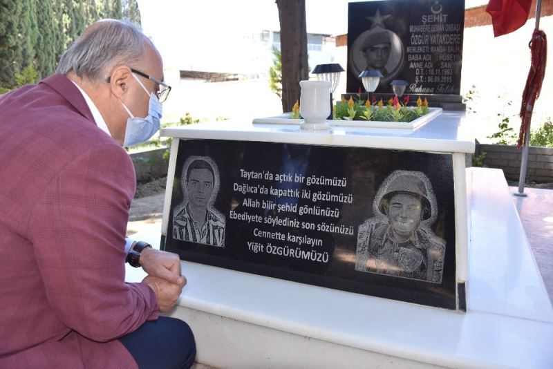 Ziyarette, kabirleri başında tüm şehitler için dua eden Başkan Kayda, “Yüce Allah, bu toprak için, bu vatan için ve bu bayrak için can veren tüm şehitlerimizin mekanlarını cennet eylesin. Bütün ailelerimize yeniden baş sağlığı ve sabır diliyor, bayramlarını tebrik ediyorum. Tüm şehitlerimiz için ne yapsak azdır. Ruhları şad olsun” dedi.