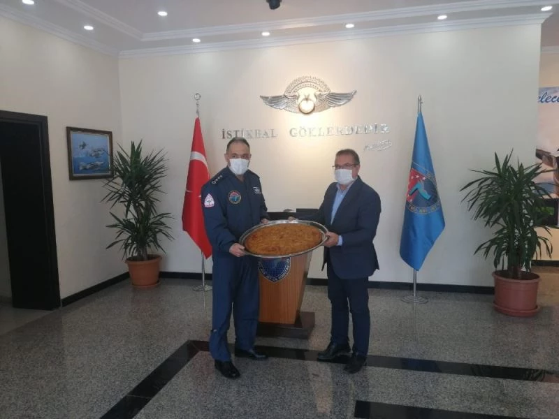 Akçadağ Belediye Başkanı Ali Kazgan’dan ziyaret ettiği 7. Ana Jet Üs Komutanı Albay Zeki Koltukoğlu’na Coğrafi İşaret Belgesi alınan yöresel lezzetlerden "Akçadağ Kömbesi" ikramında bulundu.