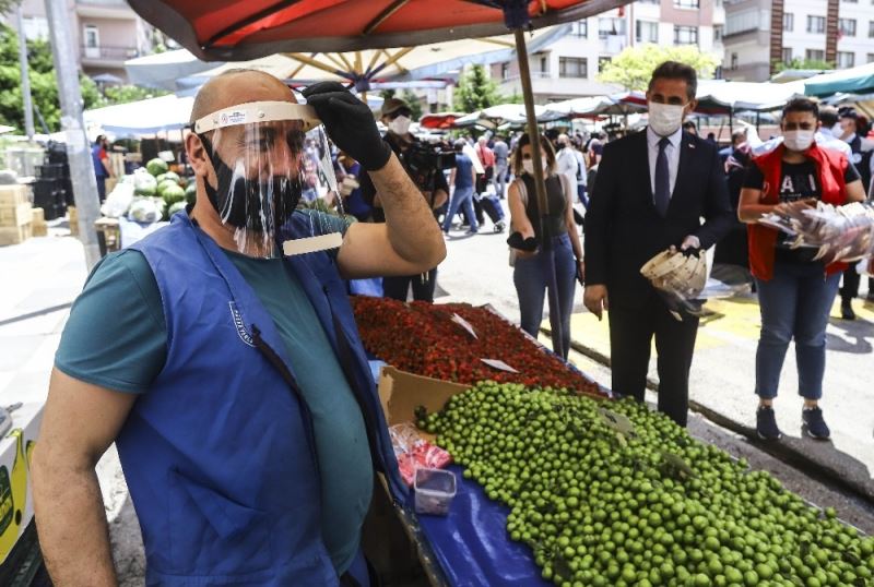 Mamak Belediye Başkanı Murat Köse, pazarcı esnafı, berber ve kuaförleri ziyaret ederek siperlik ile maske dağıttı.