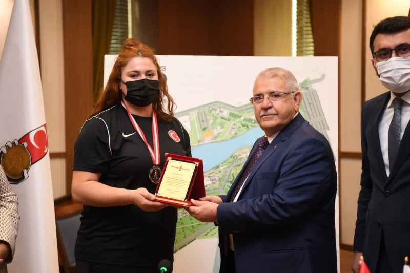 Onikişubat Belediye Başkanı Hanefi Mahçiçek, Moskova’da gerçekleştirilen Avrupa Şampiyonasında üçüncü olan Kahramanmaraşlı milli halterci Melike Günal’ı tebrik edip hediyeler verdi.