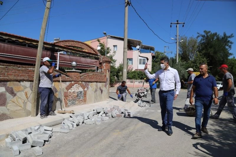 Menderes Belediye Başkanı Mustafa Kayalar, kentte ekipler tarafından yapılan kaldırım çalışmalarını yerinde inceledi.