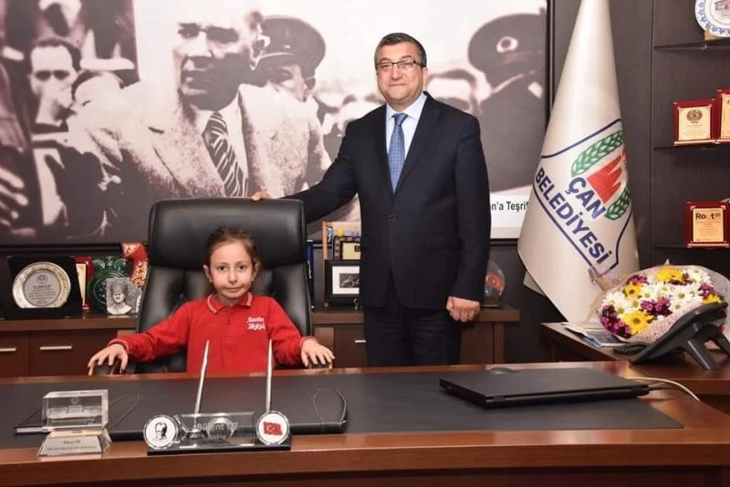 Çan Belediye Başkanı Bülent Öz, sınıf başkanlığı seçiminde arkadaşlarına Belediye Başkanını ziyaret vaadinde bulunan öğrenciyi, arkadaşları ve öğretmenleriyle birlikte makamında misafir etti.