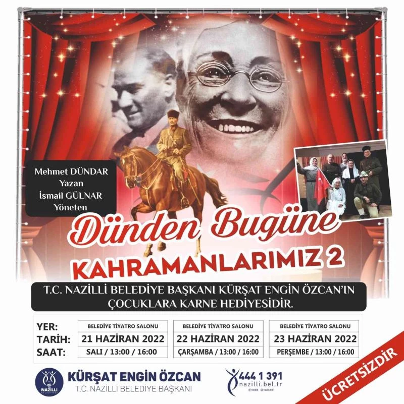 Dünden Bugüne Kahramanlarımız 2 tiyatro oyunu 21-22-23 Haziran’da Nazilli Belediyesi Tiyatro Salonu’nda izleyicilerle buluşacak. Mehmet Dündar’ın yazdığı ve İsmail Gülnar’ın yönetmenliğini yaptığı oyun 3 gün boyunca 13.00 ve 16.00 saatlerinde 2 seans olarak sahnelenecek.