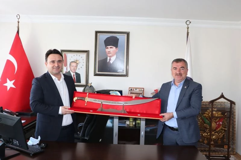 Başkan Özdemir ziyaretin sonunda Kaymakam Yılmaz’a kılıç hediye etti.