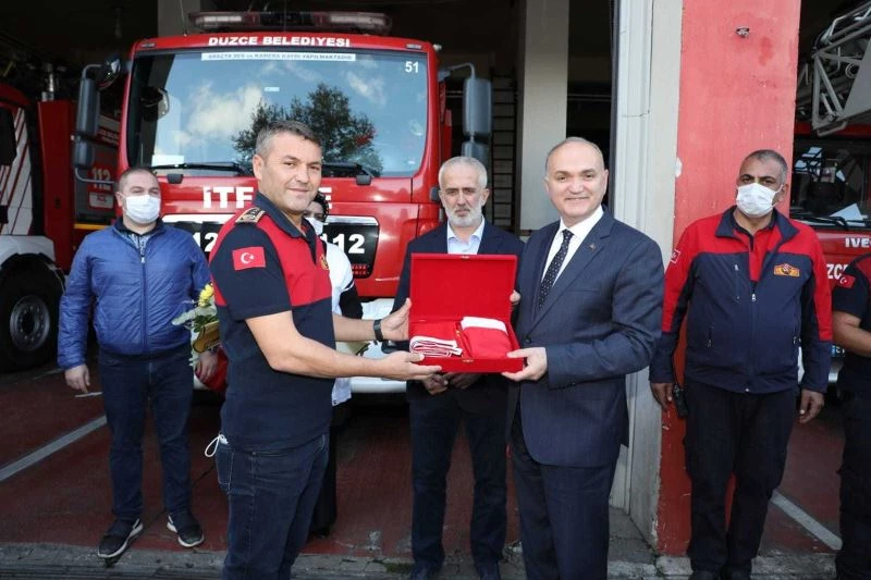 Ziyarette, İtfaiye Müdürü Mehmet Ali Kahraman tarafından Belediye Başkanı Özlü ve AK Parti İl Başkanı Keskin’e Türk bayrağı ve İtfaiye Bayrağı hediye edildi.