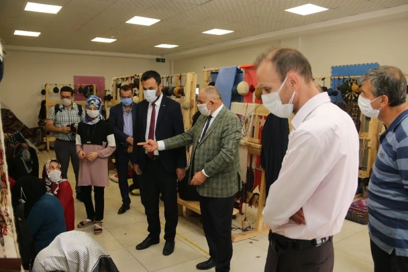 Yahyalı’da protokol üyeleri ilçede Avrupa Birliği finansörlüğünde açılan Yahyalı El Halısı dokuma kursunu ziyaret etti.