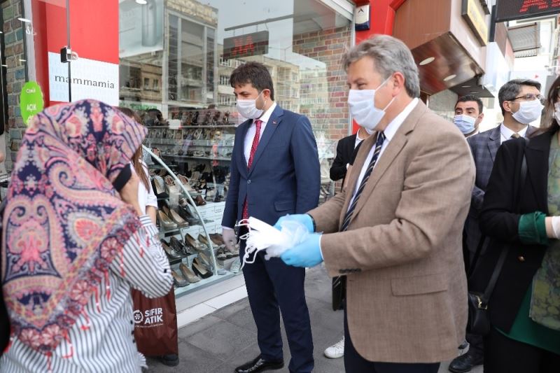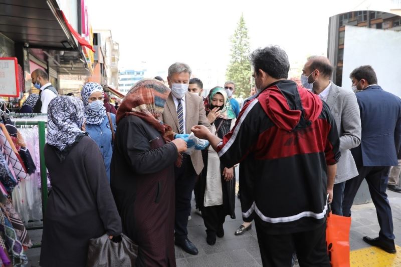 Melikgazi Belediye Başkanı Dr. Mustafa Palancıoğlu, Ramazan Bayramı nedeniyle çarşı esnafına hem maske dağıttı hem de esnafla bayramlaştı.