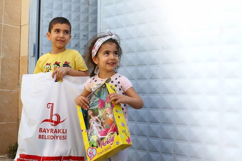 Bayraklı Belediyesi, düzenli olarak yapılan sosyal yardımlara bir yenisini daha ekleyerek Ramazan Bayramı dolayısıyla Bayraklılı çocuklara hediyeler dağıttı. Titizlikle belirlenen dar gelirli ailelerin evlerini ziyaret eden ekipler, bayramlık kıyafetler ve oyuncak paketleriyle minikleri sevindirdi. Yaş gruplarına göre ayrılan birbirinden güzel kıyafetleri ve oyuncakları tek tek paketleyen Sosyal Yardım İşleri Müdürlüğü ekipleri bayram öncesi çocuklara hediyelerini ulaştırırken, miniklerin mutluluğu görülmeye değerdi.