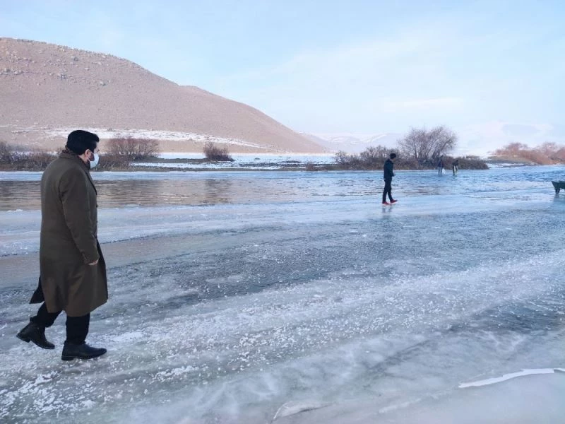 Belediye Başkanı Savcı Sayan, köyden gelen vatandaşlarla buz tutmuş Murat Nehri üzerinde çay eşliğinde sohbet ederek hatıra fotoğrafı çektirdi.