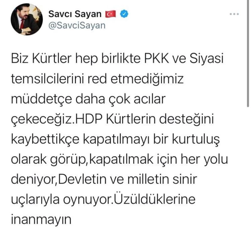 Belediye Başkanı Savcı Sayan, sosyal medya hesabından yaptığı paylaşımda Kürtler’in PKK ve siyasi temsilcilerini reddetmesi gerektiğini vurgulayarak, HDP’nin, Kürtler’in desteğini kaybettiği için kapatılmayı bir kurtuluş olarak gördüğünü belirtti.
