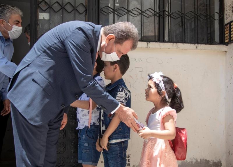 Seçer, evden çıkışı sırasında kendisiyle selamlaşan çocuklara da bayram şekeri ikram etti.