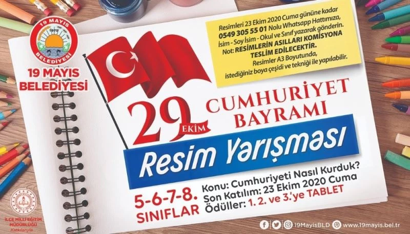 23 Nisan Ulusal Egemenlik ve Çocuk Bayramı, 19 Mayıs Gençlik ve Spor Bayramı’nda düzenlediği yarışmalarla dereceye giren öğrencilere bisiklet ve tablet hediye eden ayrıca katılan tüm öğrencilere çeşitli hediyeler gönderen 19 Mayıs Belediyesi, 29 Ekim Cumhuriyet Bayramı dolayısıyla düzenleyeceği yarışmada, İlçe Milli Eğitim Müdürlüğünün kuracağı komisyona havale edilecek olan resimler arasından dereceye girecek birinci, ikinci ve üçüncüye tablet ödülü verecek. İlçede ikametgâh eden ve öğrenim gören öğrenciler, isim-soy isim-okul ve sınıf yazarak, A3 boyunda istedikleri boya çeşidi ve boyama etkinliğini seçerek hazırladıkları resimlerini 23 Ekim 2020 Cuma gününe kadar 0549 305 55 01 numaralı whatsapp hattına göndererek yarışmaya katılabilir. Resimlerin asılları ise İlçe Milli Eğitimde kurulacak olan komisyona teslim edilecek.