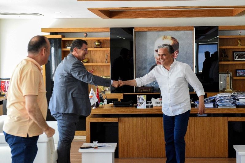AESOB Başkanı Dere, korona virüs salgının en üst düzeyde devam ettiği günlerde, esnafa maske ve işyerlerinin dezenfeksiyonu konusunda verdiği destek dolayasıyla Başkan Ümit Uysal’a teşekkür ziyaretinde bulundu. Ziyarette Başkanvekilleri Bayram Dal, Mehmet Ali Gülaçtı, Genel Sekreter Mehmet Işıldağ, Yönetim Kurulu Üyeleri Süleyman Şahin, Hüseyin Şimşek, Disiplin Kurulu Başkanı Yusuf Kurul, Kasaplar Odası Başkanı Osman Yardımcı, Berberler Odası Başkanı Yüksel Uzun, Kuaförler ve Manikürcüler Odası Başkanı Tolgahan Demir, Antalya Semt Pazarcılar Odası Başkanı İsmail Öz yer aldı.